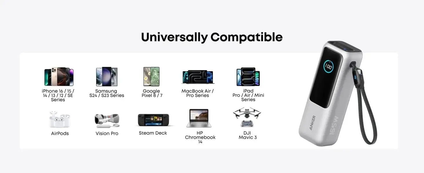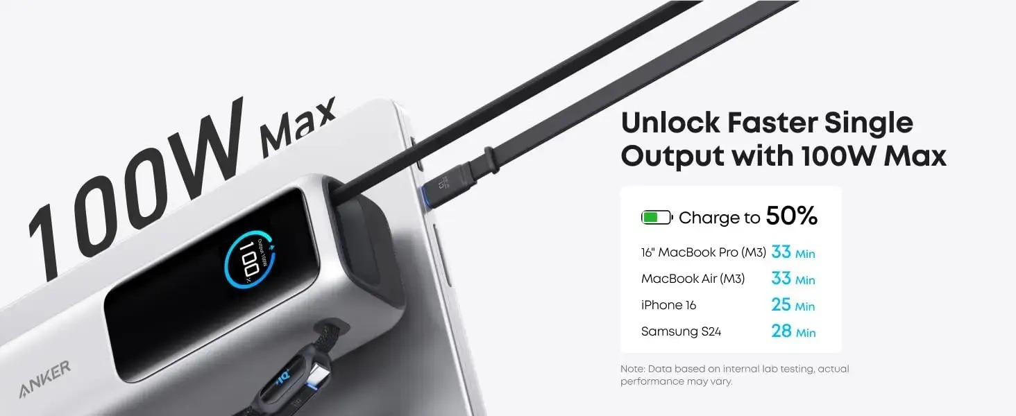 25,000mAh 的超大容量可支援您的裝置多次使用,並配備 100W 超快速充電功能