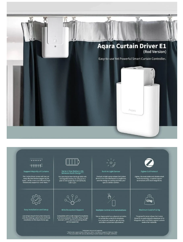Curtain Driver E1是一款電動窗簾驅動設備,可以自動控制您現有的窗簾,它基於Zigbee 3.0無線功能,可以令窗簾的定時控制,連接Aqara Home應用程序即可與其他智能設備協同工作。