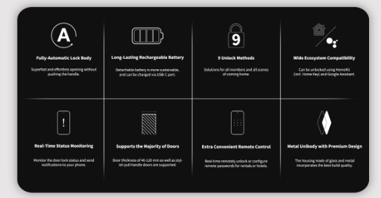 重新定義全自動,支援蘋果HomeKit智能推拉鎖。內含7種解鎖方式,輕鬆應對不同情況。