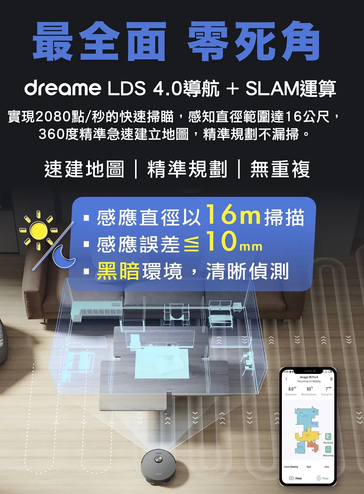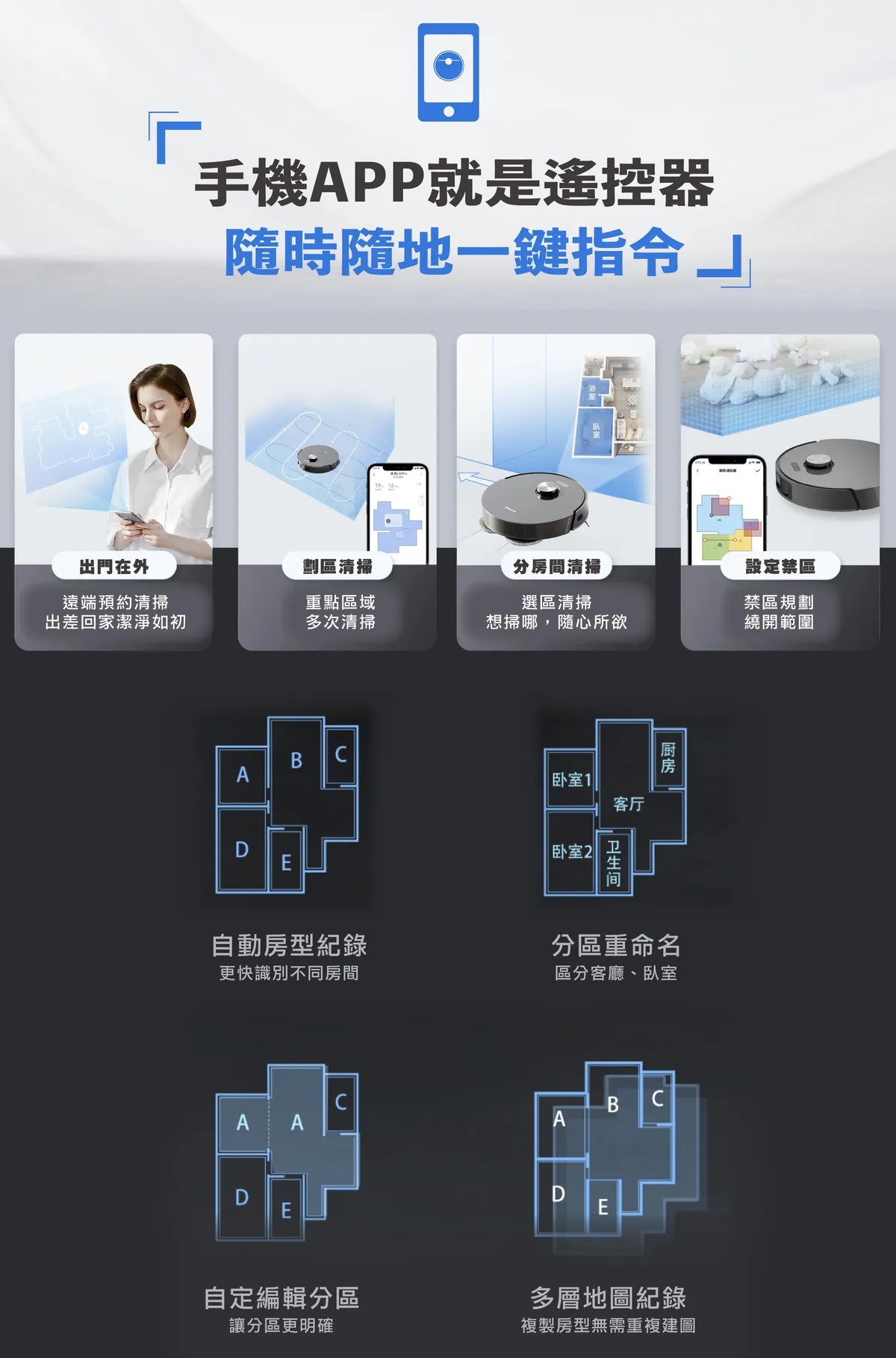 App自定規劃路線圖、多樓層地圖、清潔次序、拖把濕度及設立虛擬拖地禁區等