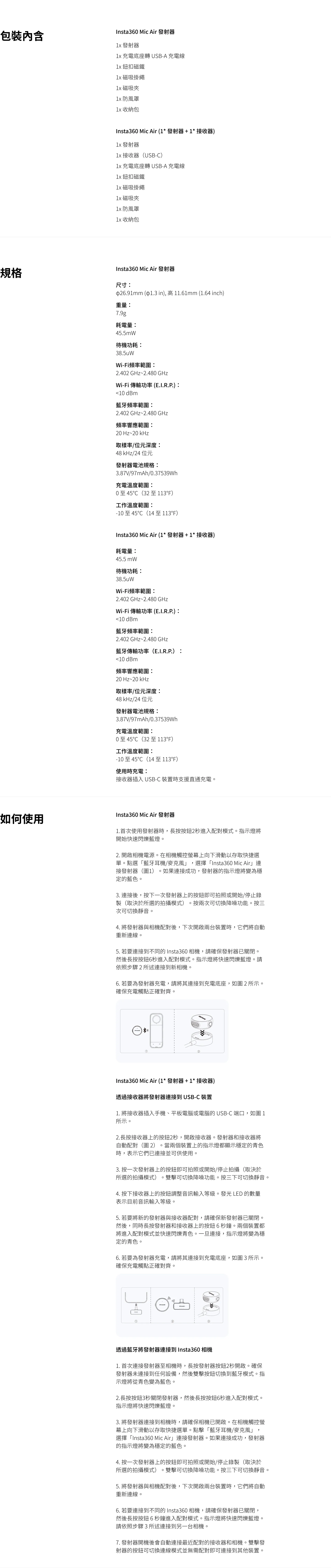 *發射器與接收器連接,在空曠、無遮蔽、無訊號干擾的環境下測得。當發射器直連Insta360 X5時,在空曠、無遮蔽、無訊號干擾的環境下,傳輸距離約 30-50m,受設備朝向、相機拍攝檔位等影響。