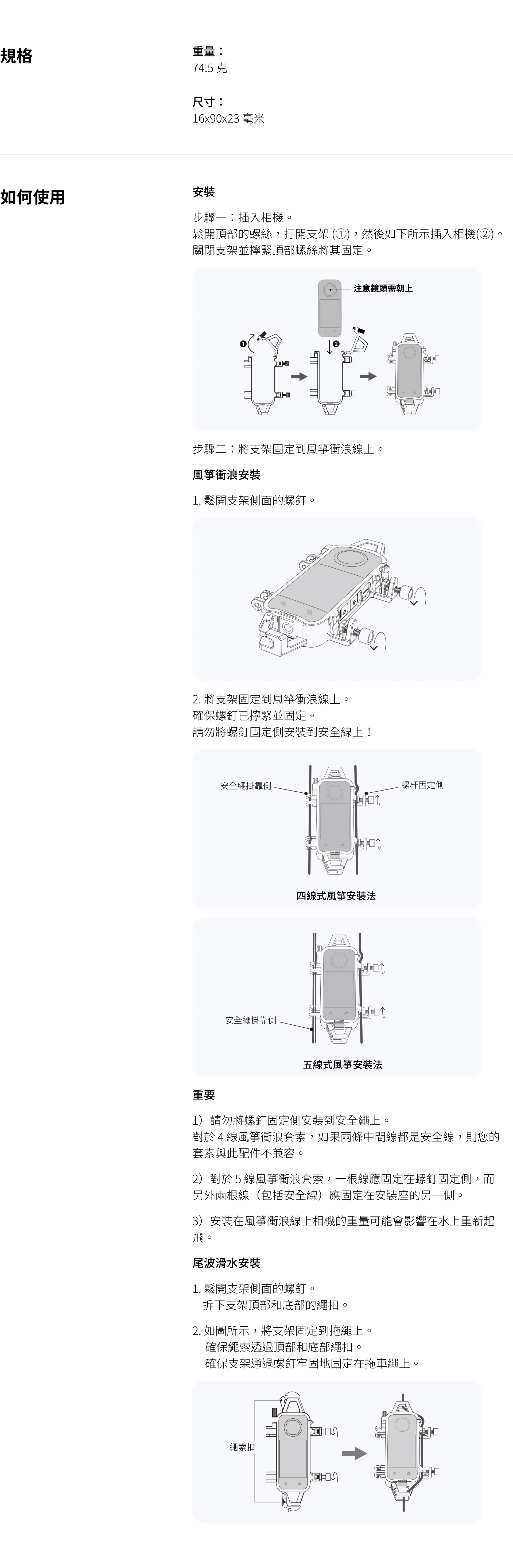 支持安裝在直徑為 1-8 毫米的堅固繩索上,建議使用風箏衝浪和尾波衝浪的套具繩索