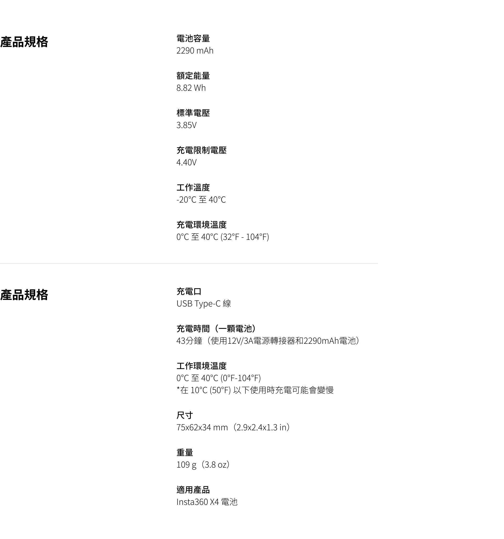 包括:1x Insta360 X4 電池,1x 電池收納盒。