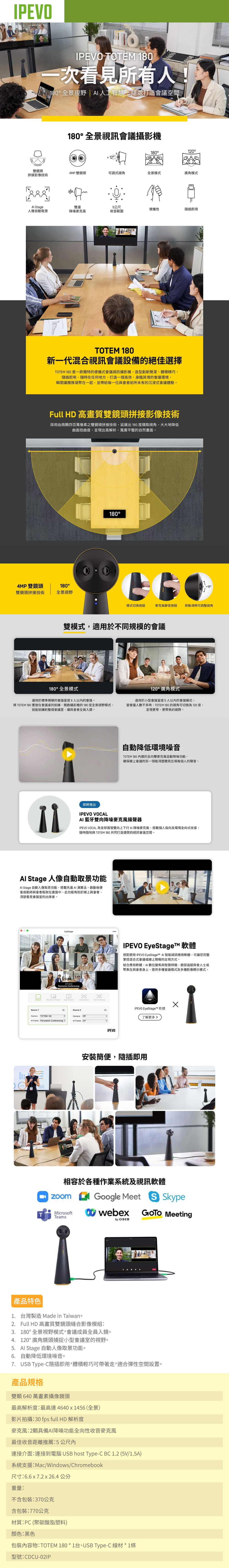 Full HD 高畫質雙鏡頭拼接影像,輕鬆切換 120° 和 180° 視角,適用於不同規模的會議