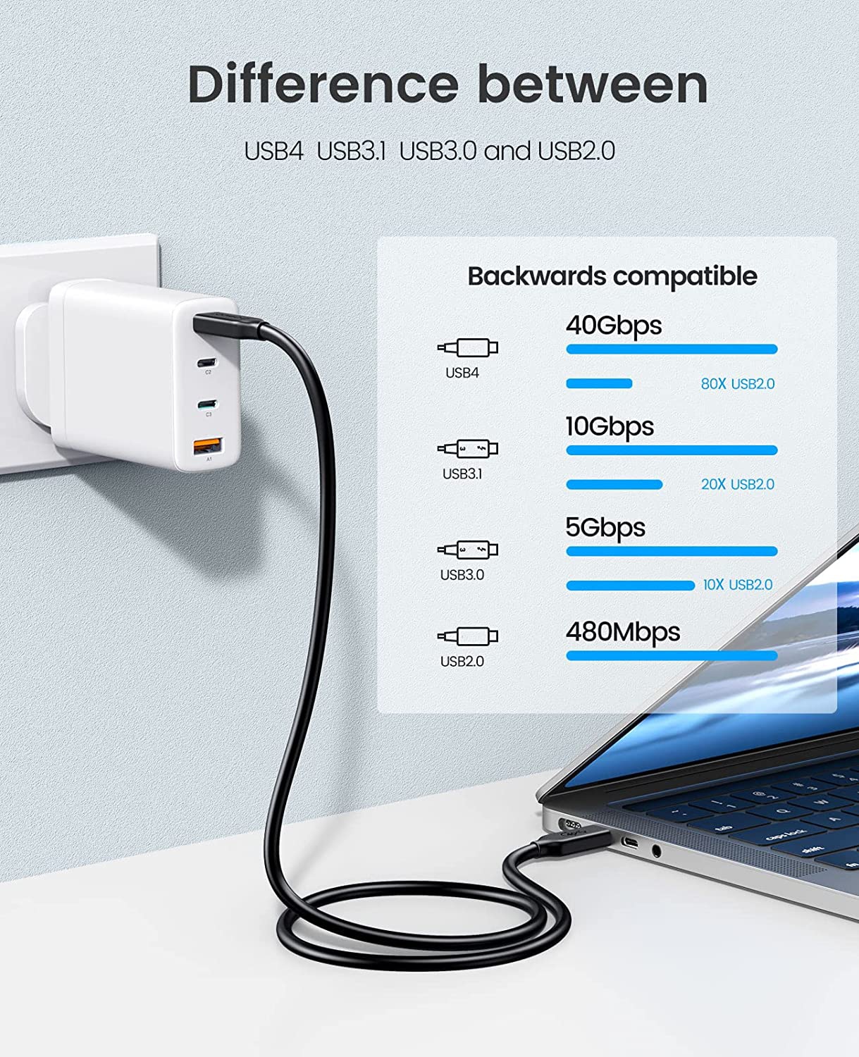 • USB4 數據線:帶 USB Type-C 連接器的 USB 4 數據線最高速度為 40Gbps(20Gbps x 2),同時傳輸 DisplayPort 視頻和音頻。
