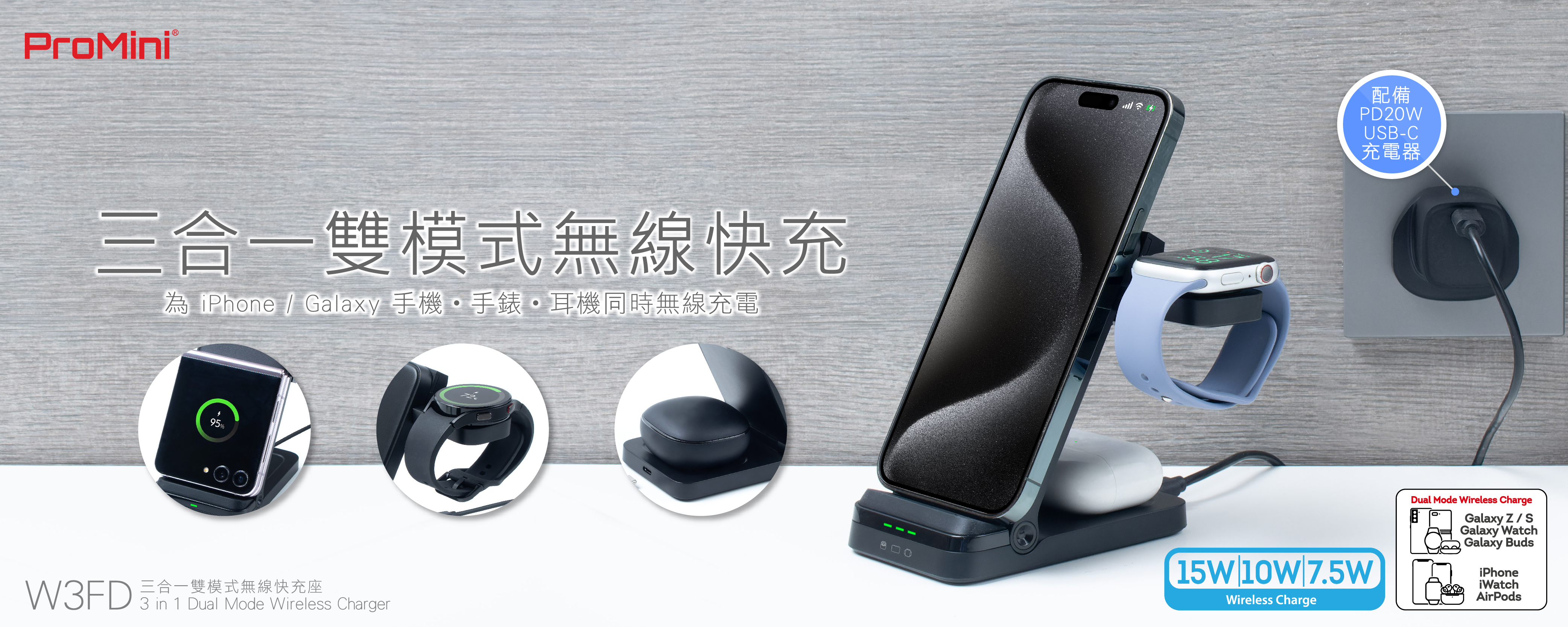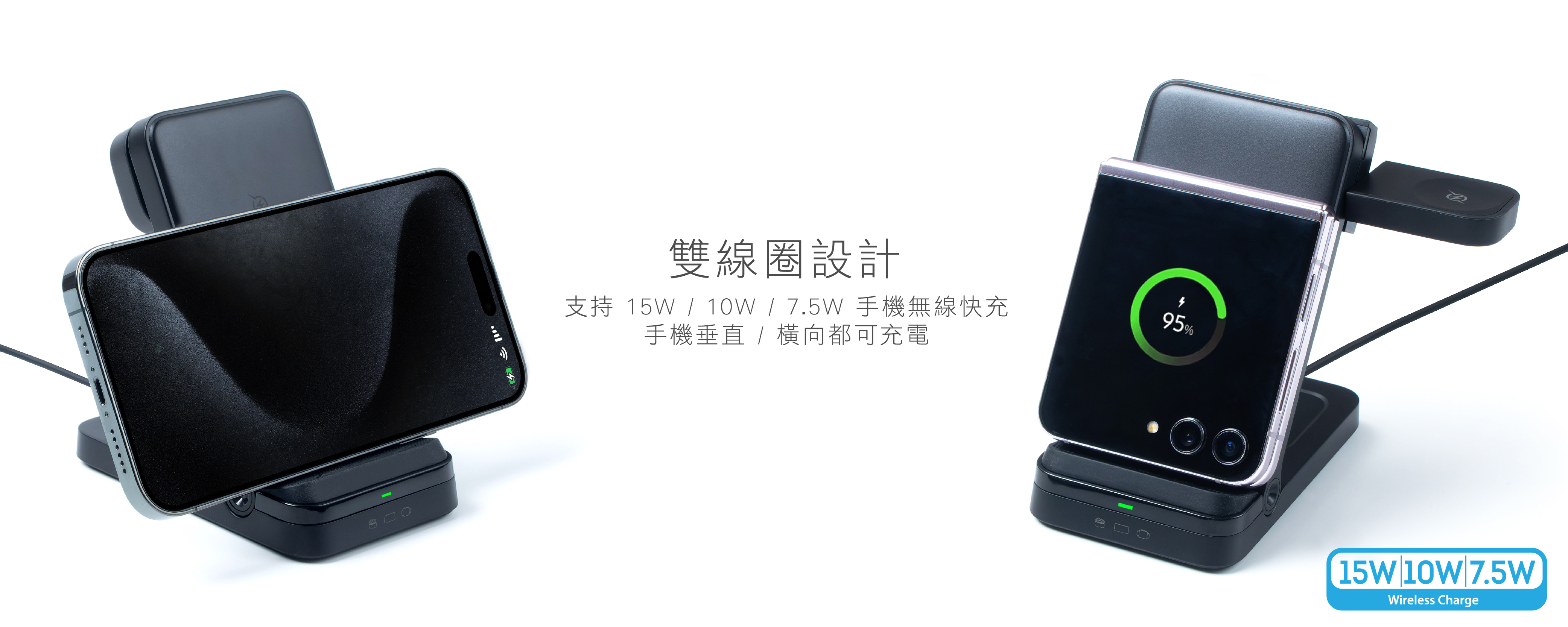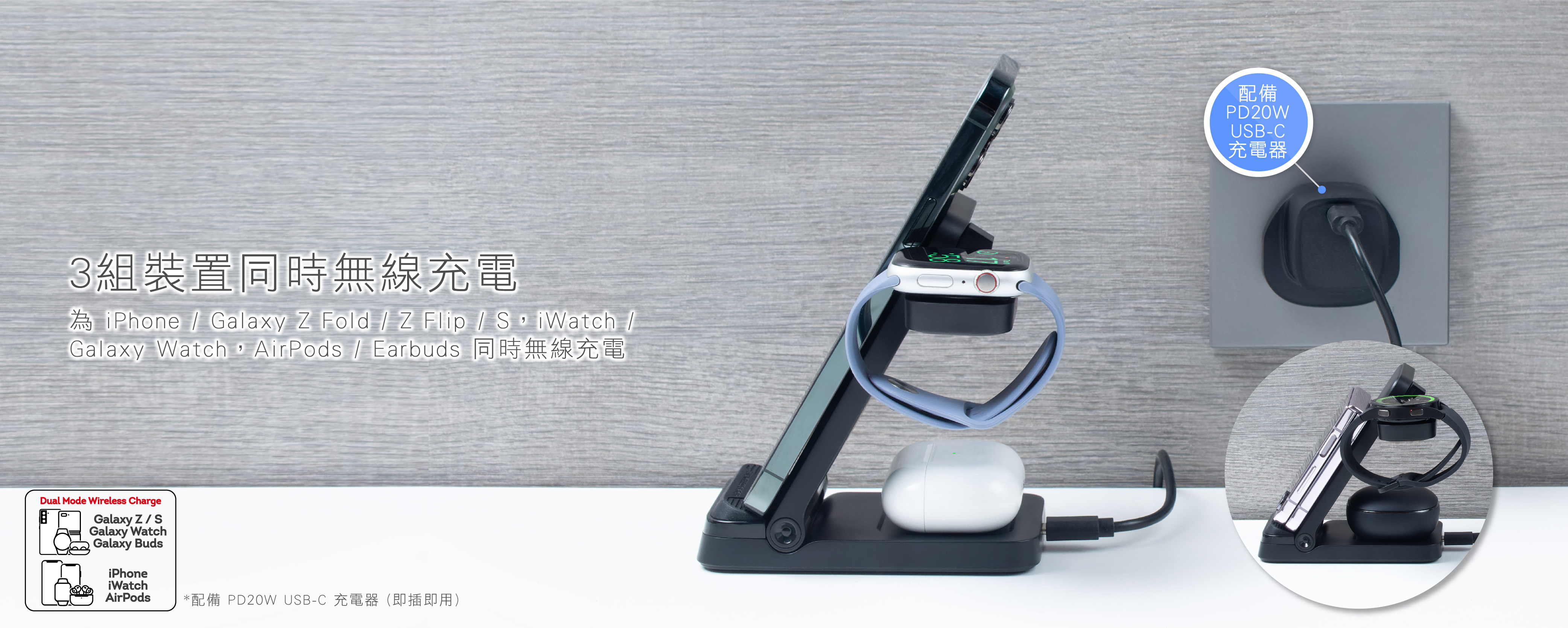 雙模式為iPhone/Galaxy Z Fold/Z Flip/S,iWatch/Galaxy Watch,AirPods/Earbuds同時無線充電