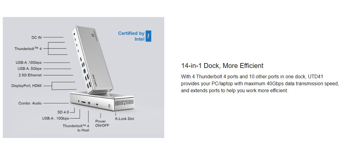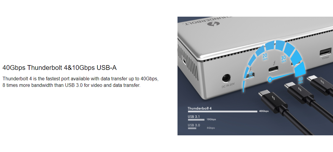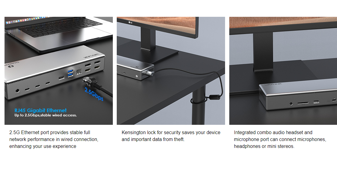 最先進的 Thunderbolt 4 和 DisplayLink 技術。具有 40Gbps 頻寬、高達 98W 的充電功率,以及透過 DisplayPort、HDMI 和 Thunderbolt 4 連接埠進行四路 4K@60Hz 視訊輸出。同時,擴充座還為您的筆記型電腦擴展了兩個 USB-A 5Gbps 連接埠、兩個 USB-A 10Gbps、一個 2.5Gbps 有線乙太網路連接、一個 SD 4.0 讀卡機和一個音訊插孔。